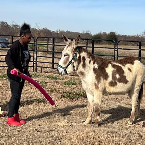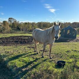 Dixie is a Tennessee Walking Horse mare rescued after a wound on her leg became infected. She was nursed back to health and became the first 'Angel in Horse Hair' to join the ranch family. Dixie stands at 16 hands and is one of the socialites with visitors and participants. Her favorite past-time is eating and being brushed!
